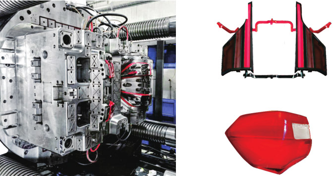 射出部分有兩組獨立之料管組,同步做射出動作,雙色一次成型,可大幅縮短成型周期,增加經(jīng)營利潤。